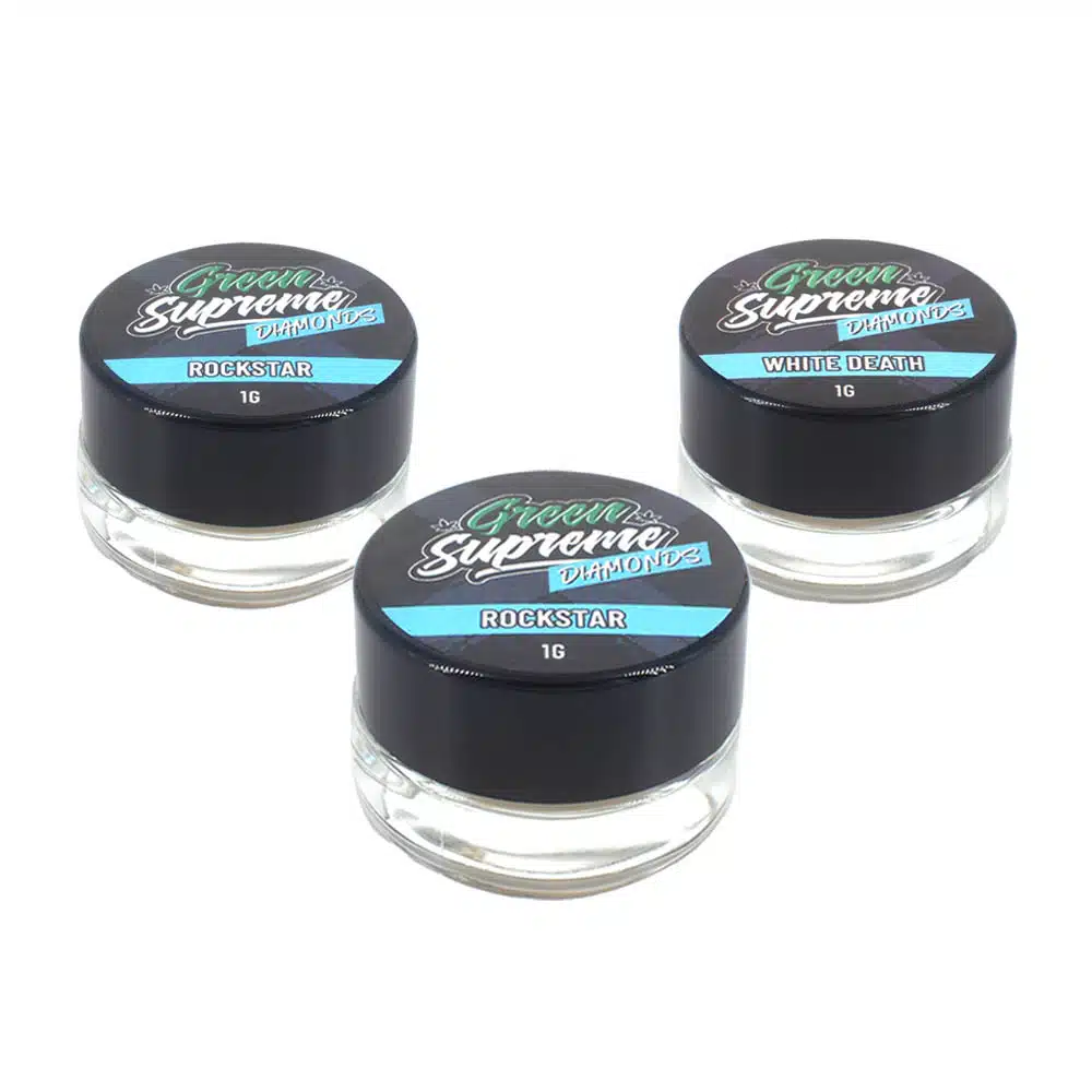Green Supreme – 3 Pack Diamonds are one of the newest marijuana concentrates to hit the market. They are amber in colour, have a beautiful crystal like shape and texture, and are known for their incredible potency. They are made up of almost pure THCA (tetrahydrocannabinolic acid), which is a cannabinoid that directly converts into THC when exposed to heat. THC diamonds are for the more experienced users as they have a stunning potency of 95% or higher making it the strongest and purest form of cannabis concentrates available. Because of their strength many users like to use small amounts of the diamonds as a mixer with bud or other forms of concentrates they are smoking, although they can definitely be just smoked straight up. THC Diamonds are also known as THC crystallines, THC-A diamonds and THC-A crystallines.